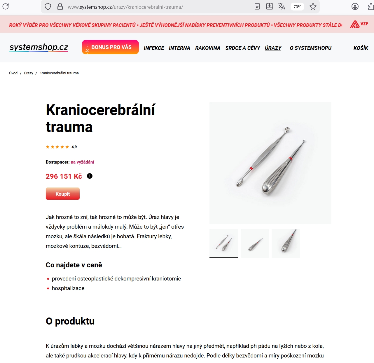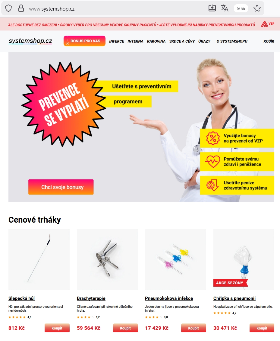 Systemshop.cz je rádoby vtipná variace na téma „prevence“. Například se dozvíte, že slepeckou hůl za 812 Kč máte u VZP zdarma. Nebo že za 2 080 Kč vám VZP zaplatí inkontinenční prostěradlo. Dozvíte se, že vaše kraniocerebrální trauma bude stát VZP 296 151 Kč. Oni jsou tak skvělí, že vám léčbu zaplatí. Web nás vlastně trochu krkolomně nabádá, abychom si to rozmysleli a frakturu lebky a zhmoždění mozku raději nepodstupovali, protože VZP by to stálo moc peněz. Zde screenshoty, pokud by náhodou stránky zmizely.