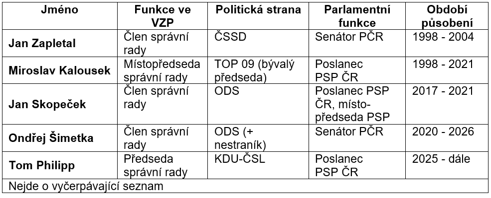 Tabulka: příklady provázanosti politiků a VZP z historie