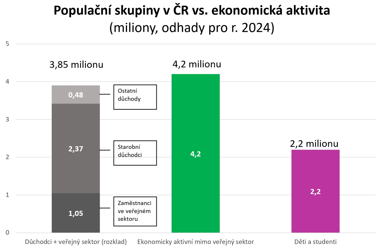 Ekonomicky aktivní lidé mimo veřejný sektor, musí uživit sebe, své děti a zbytek populace, tj. dalších cca 6 milionů obyvatel. Díky systému průběžného financování důchodů i zdravotní péče v ČR musí 4,2 milionu ekonomicky aktivních lidí v soukromém sektoru, ufinancovat 3,85 milionu důchodců (starobních a invalidních) a zaměstnanců veřejného sektoru – těch je 1,05 milionu. Odkazuji na paní Šichtařovou, která se nebála toto číslo v jedné debatě uvést.