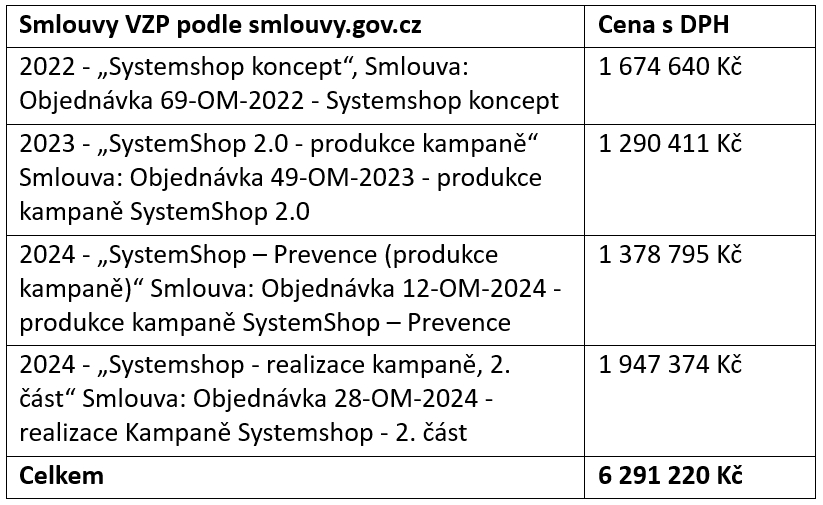 - Mediální agentuře Remmark zaplatila VZP 14,5 milionu Kč aby na web SYSTEMSHOP.CZ někdo vůbec přišel: viz „Prevence – SystemShop 2024“ – nákup mediálního prostoru za 14 516 706 Kč s DPH (https://www.hlidacstatu.cz/hledatSmlouvy?q=icoPrijemce%3A25652869+AND+icoPlatce%3A41197518 )