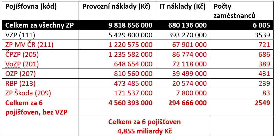 Provozní a IT náklady oborových zdravotních pojišťoven (bez VZP) za rok 2023 činí 4,855 miliardy Kč. Jde o zbytečně vynaložené náklady, protože jak si řekneme dále, VZP dnes má cca 6 milionů pojištěnců a je schopna obsloužit bez nákladného navyšování kapacity i zbylé 4 miliony pojištěnců. VZP dokáže přijmout „konkurenční“ pojištěnce bez významného zvýšení své kapacity, zvlášť pokud k přechodu dojde postupně během 2-3 let. Navíc fakt, že zmizí „konkurenční“ pojišťovny, sníží požadavky na práci mnoha lidí v pobočkové síti a na centrále VZP, věnované obsluze přicházejících a odcházejících pojištěnců a také zmizí nutnost držet marketingové oddělení VZP, které bude možno zredukovat na minimum. (O tom podrobně dále.)