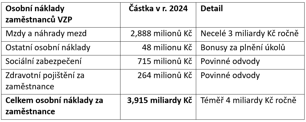 Tabulka: členění osobních nákladů zaměstnanců VZP (2024)