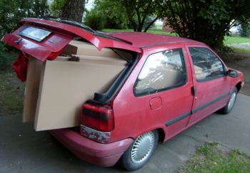 A jak je to s praktičností třídveřového vozidla při stavbě? Budete se asi divit, ale ujde to. U takto starého vozu to znamená o dvoje panty, dva zámky a dvě okénka míň co se může rozbít, kufr je přístupný dobře i z interiéru předními dveřmi po sklopení sedadla spolujezdce, možná ještě lépe než u 5D zadními díky větší šířce dveří. Odvezlo toho spoustu, kuchyň z IKEy jela nadvakrát, z jízd je připojené foto. Vím, že by dodávka byla vhodnější, ale jak jsem již uvedl, prim hrála cena. Auto svůj úkol splnilo, odsloužilo si svoje, občas drhlo zadním nárazníkem o zem, občas bylo zatracováno pro své nepohodlí na delších cestách, ale mám ho rád a nedám na ZX dopustit.
