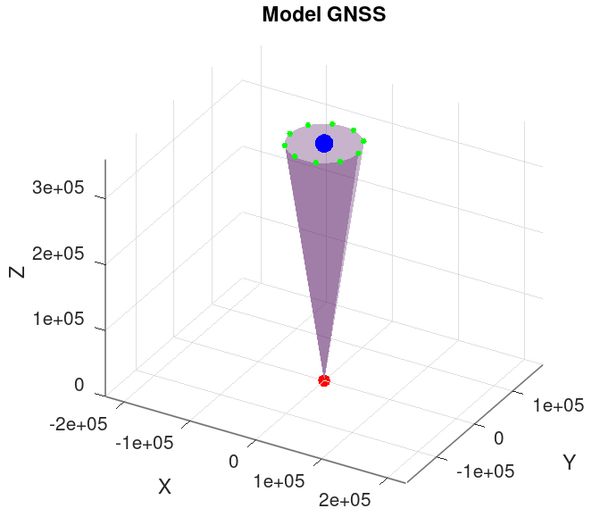 Pro p.t. čtenáře snad bude zajímavé využít poznatky z minula a zkusit si spočítat DOP, tedy kvalitu geometrie – byť v tomto případě je kvalita na hony vzdálená všemu, na co jsem z GNSS zvyklý. Víme, že experiment používal GPS a Galileo, oboje pro zjednodušení „posadíme“ do stejné kružnice s poloměrem 26 tisíc km, a všechny satelity po této kružnici rovnoměrně rozmístíme. Vznikne nám tak v podstatě velmi úzký a dlouhý kužel, na jehož základně jsou satelity.
