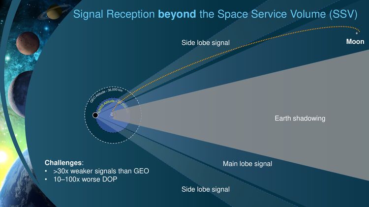 Ilustrace, jakým způsobem se může GNSS signál dostat až na Měsíc. Povšimněte si výzev vlevo dole a srovnejte s našimi hrubými odhady