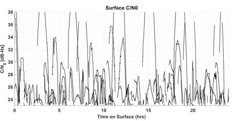 V té první si všimneme, že v popisu hardware je u antény uvedeno „field of view 10deg“, takže naše úvaha o úhlech byla správná. Ještě si vypůjčím pěkný obrázek ilustrující, jak moc omezený výběr satelitů přijímač na Měsíci má, a také graf očekávané síly signálu. Náš odhad, že síla signálu bude (hluboko) pod 40 dB-Hz sedí. Nízké hodnoty mají zřejmě na svědomí signály zachycené z vedlejších laloků.