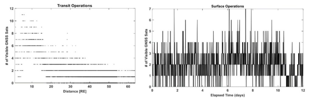 Může se zdát, že graf vlevo dává až příliš dobré výsledky, nicméně nezapomeňme, že zahrnuje i místa blízko Země (graficky to je znázorněno na onom slide č. 5 nahoře). Těm budou pravděpodobně odpovídat body na grafu, kdy je vysoký počet viditelných satelitů, byť to je moje ničím nepotvrzená domněnka. Vpravo je pak samotný povrch Měsíce a nevypadá to na mnoho příležitostí na fix – nejčastěji jsou vidět pouze dva až tři satelity… Ale podle prezentace NASA by fix měl být k dispozici více než 10 procent času.