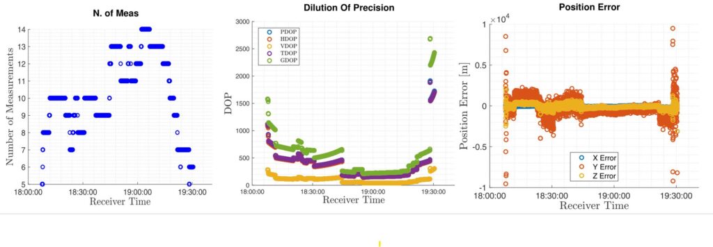 Druhá sada grafů je ještě zajímavější, protože jednak pracuje s až 14 satelity naráz (což v první sadě vůbec není), jednak ukazuje spočtenou DOP – a ano, byli jsme velicí optimisté. I v nejlepších případech je HDOP někde kolem 150 (odečteno od oka), takže každý metr statistické chyby v pseudorange znamená zvětšení okruhu pro 1σ o 150 metrů. Graf chyby v poloze je ideální kandidát na zařazení do katalogu odstrašujících případů, jak grafy nedělat, protože z něho nevyčtete skoro nic. Jó, být tam třeba histogram…
