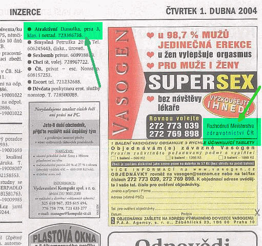 Když už to tedy zašlo tak daleko, bylo by zatěžko říci zadavatelům inzerátů, hej vy pane s tím Vasogenem, ten váš inzerát je úplná hovadina? Danuško, ty kurvo jedna blbá, to musíš napsat „prsa vel.3“ nebo „prsa č.3“, ale prsa 3 vypadá poněkud divně? Nikdy bych nevěřil, že čtení inzerátů, které jsem doposud praktikoval skutečně výjimečně, může být tak zábavné. Hodlám v tom pokračovat a o zjištěné poznatky se znovu podělit.