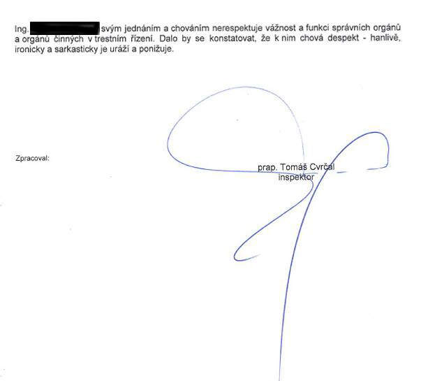 3. Však jo, nedělám si iluze. Na oddělení PČR Odolena Voda jsem nějakou dobu cíleně ponižoval (k poveselení jeho kolegů – dal jsem je vždy všechny do kopie mailů) „inspektora“ Cvrčála. Můj advokát o něm vyzjistil, že do Odolky jej přeložili poté, co dal pěstí nadřízenému – ten prý na něj měl poznámky, že je gerontofil, neb chodí s o 20 let starší bábou.